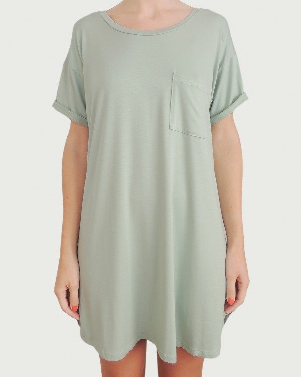 Remerón manga corta hasta arriba de las rodillas, cuello redondo, bolsillo, terminación curva