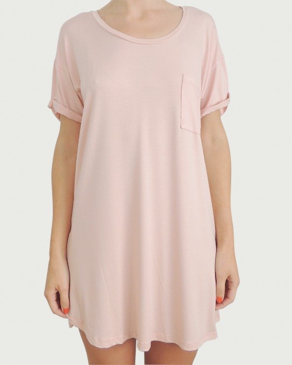Remerón manga corta hasta arriba de las rodillas, cuello redondo, bolsillo, terminación curva