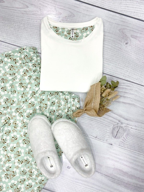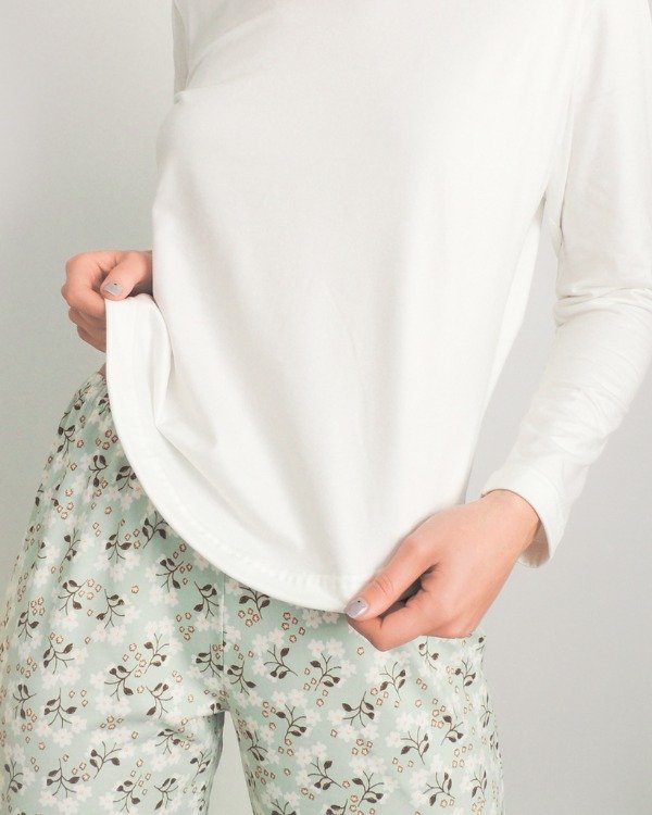 Remera amplia con escote redondo y espaldín estampado en combinación con el pantalón de calce amplio y elástico completo en cintura.