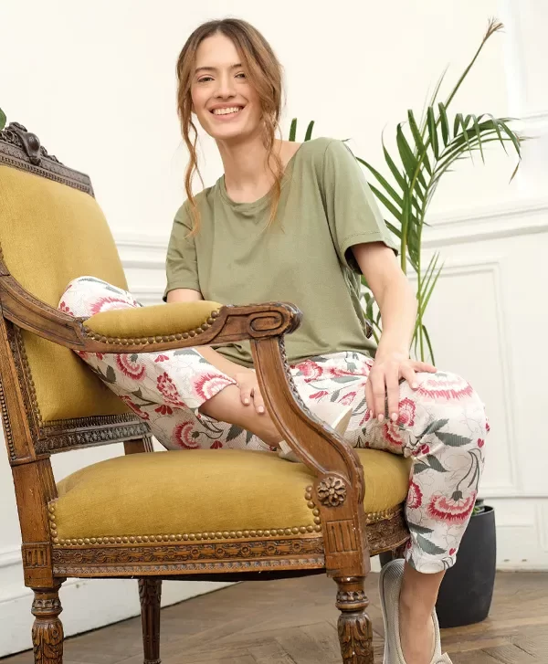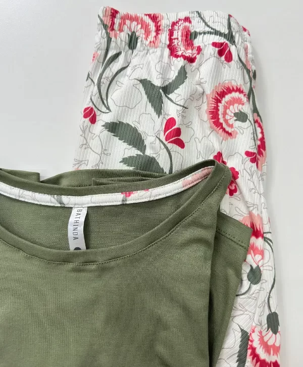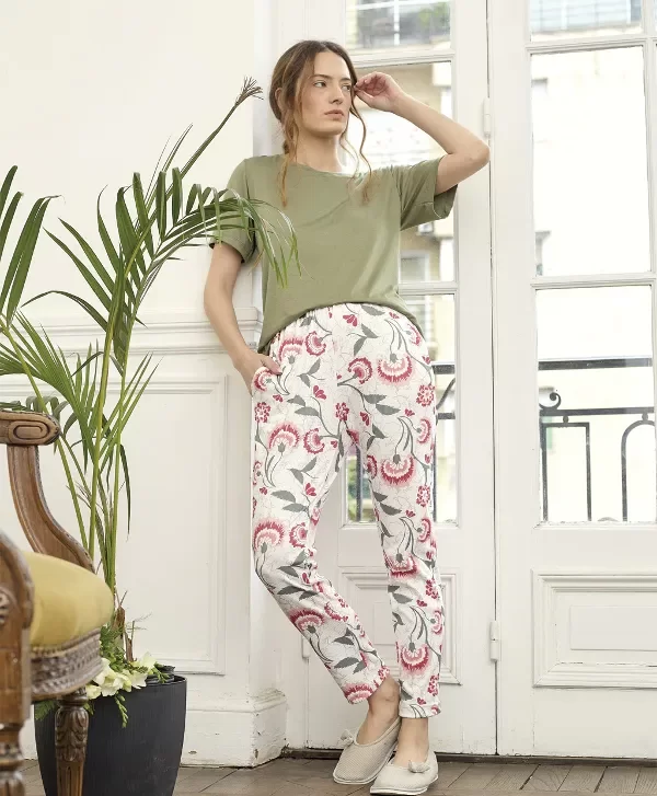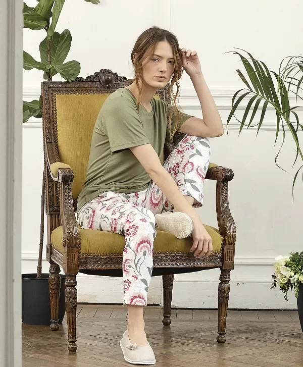 Remera verde. Pantalón de morley estampado.