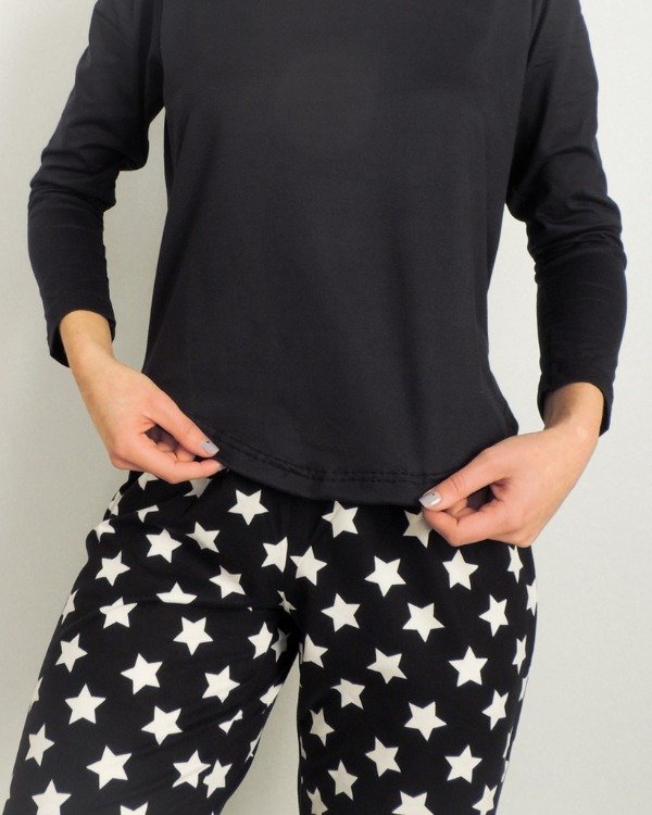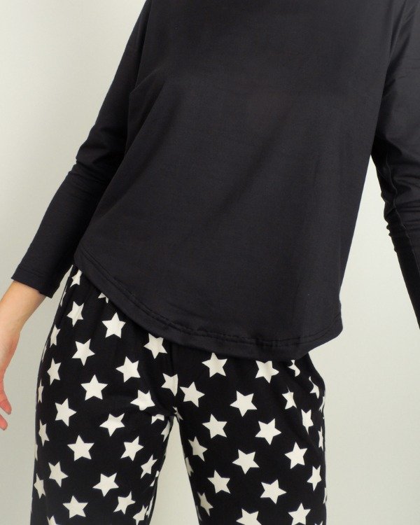 Remera amplia con escote redondo y espaldín estampado en combinación con el pantalón de calce amplio y elástico completo en cintura.