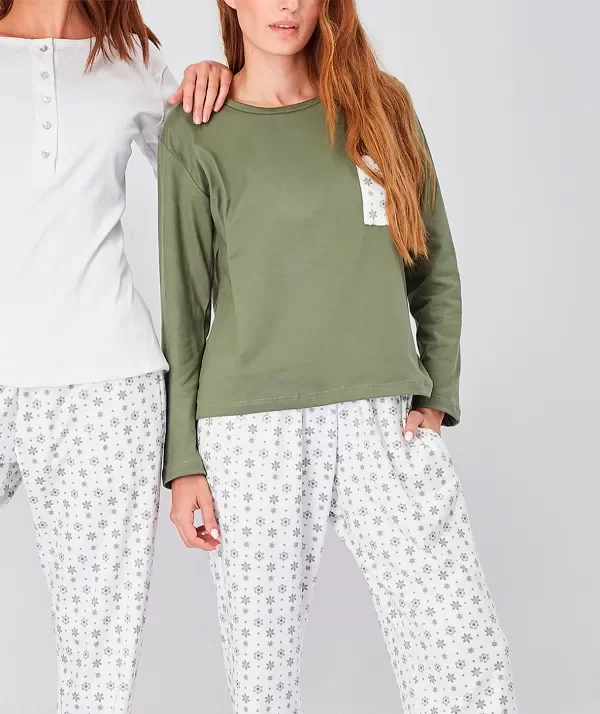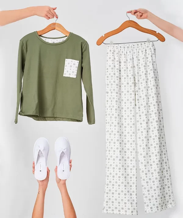 Remera verde con bolsillo estampado. Pantalón estampado.