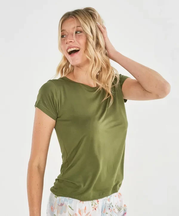 Remera manga corta de jersey y viscosa, cuello redondo y terminación curva.