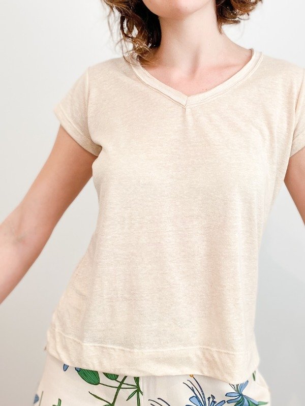 Remera manga corta de jersey, escote V, abertura lateral y desnivel en espalda con respecto a delantero
